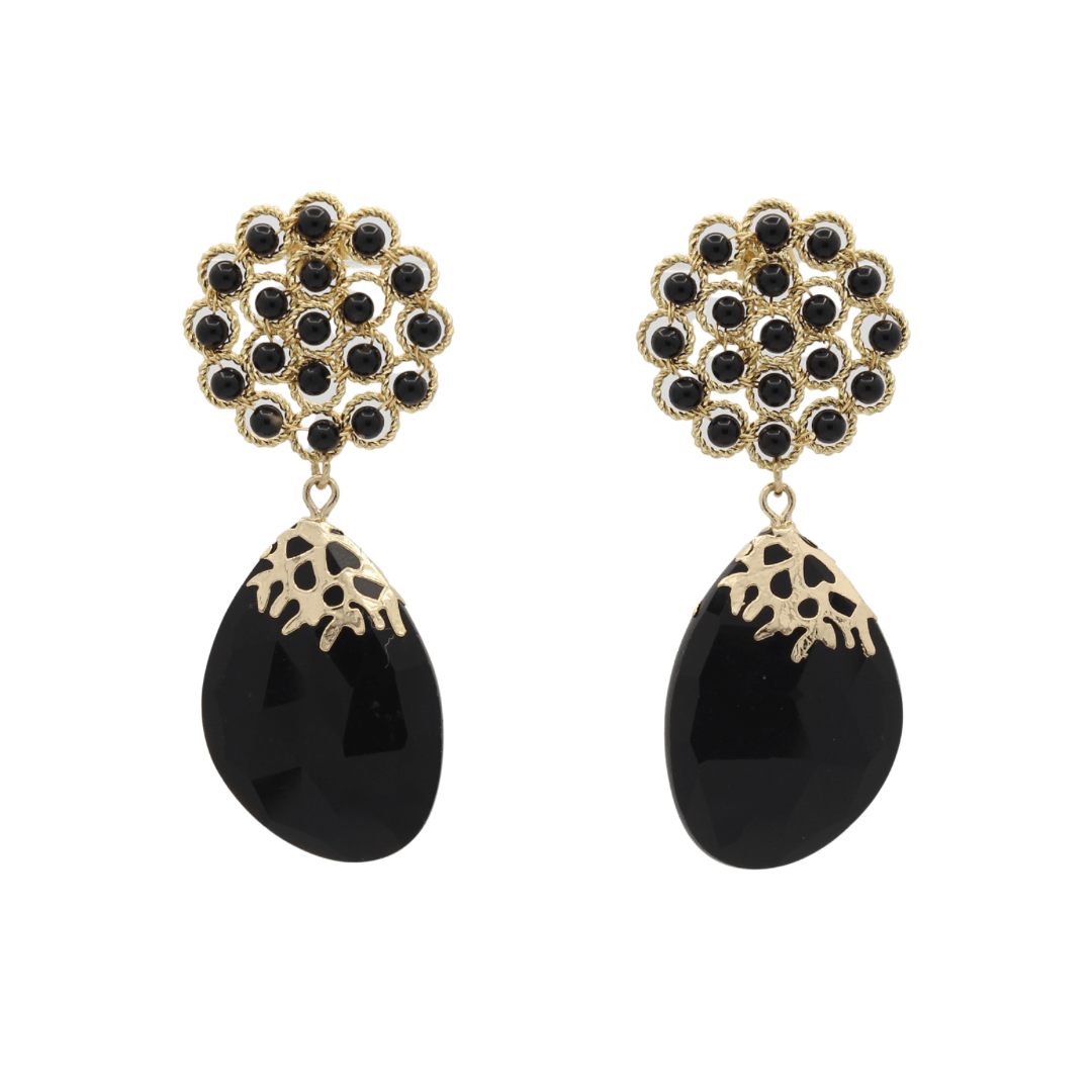 Stijlvol en krachtig: de Beaded Flower & Onyx oorstekers. Deze 6 cm lange oorbellen combineren zwarte onyx kraaltjes met een elegante druppelvormige onyx hanger. Tijdloos en chic in zwart en goud.