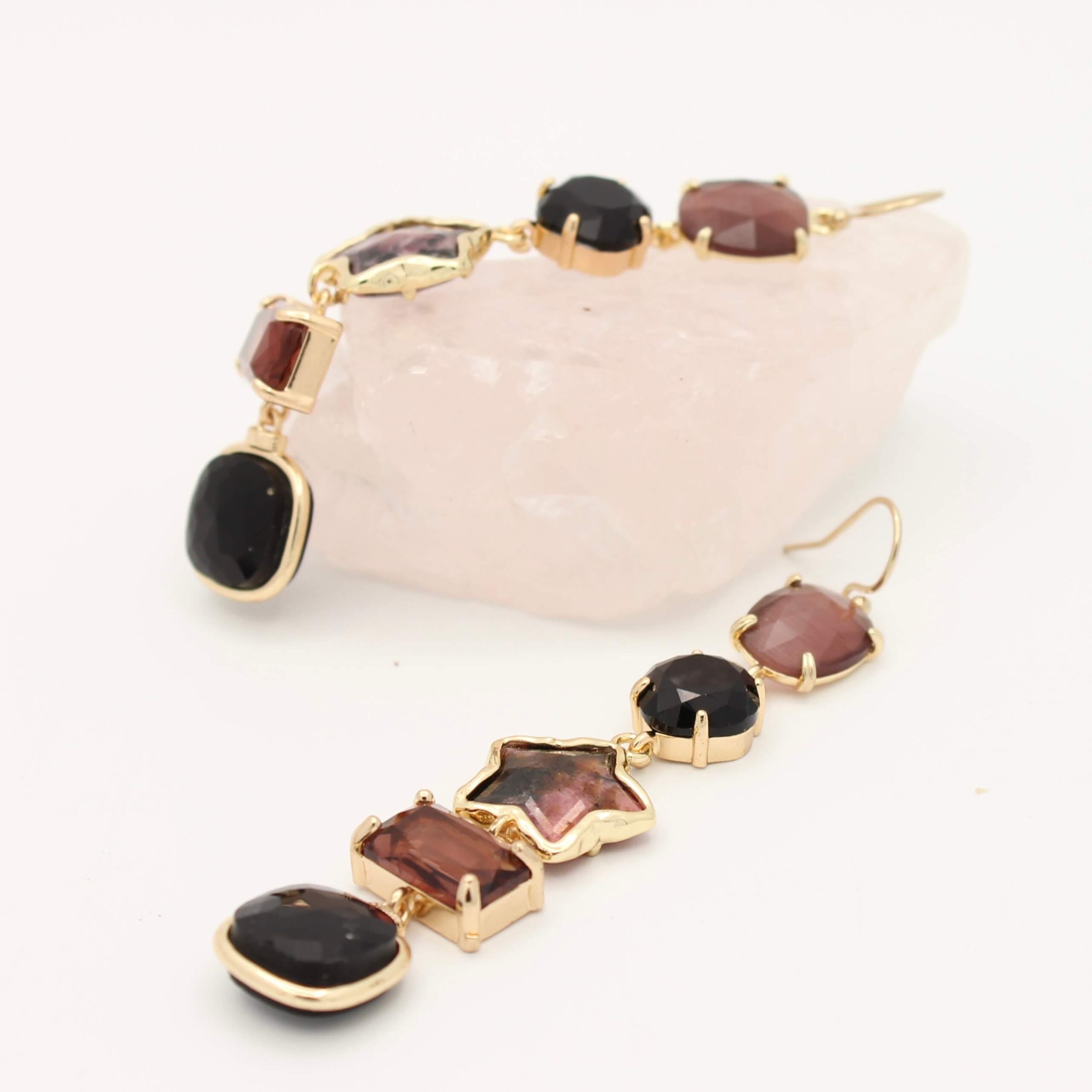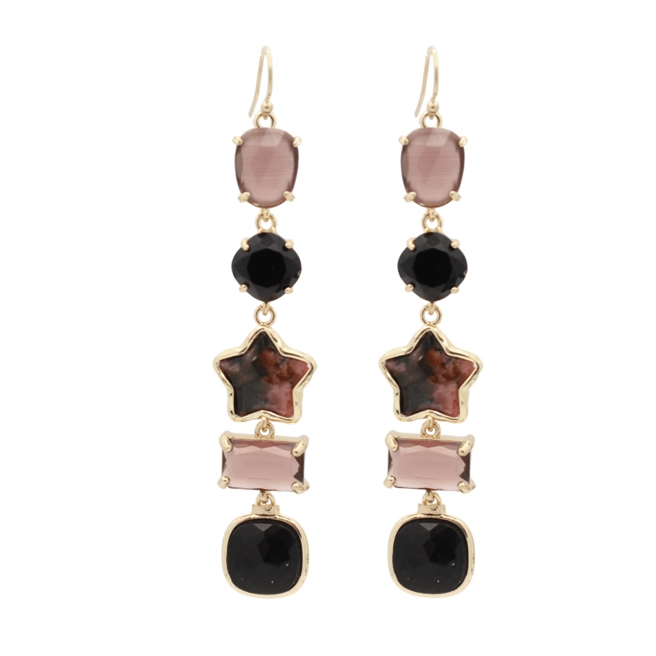 Voeg kleur en elegantie toe aan je look met deze prachtige oorbellen met vijf hangers van 9 cm lang. Elke hanger is zorgvuldig uitgezocht en straalt luxe en kwaliteit uit. De combinatie van rijke Burgundy tinten, krachtig Rhodonite en zwart Onyx, zorgt voor een stijlvolle, veelzijdige uitstraling. Deze statement oorbellen zijn perfect voor feestjes, speciale gelegenheden of om je dagelijkse outfit een opvallende upgrade te geven