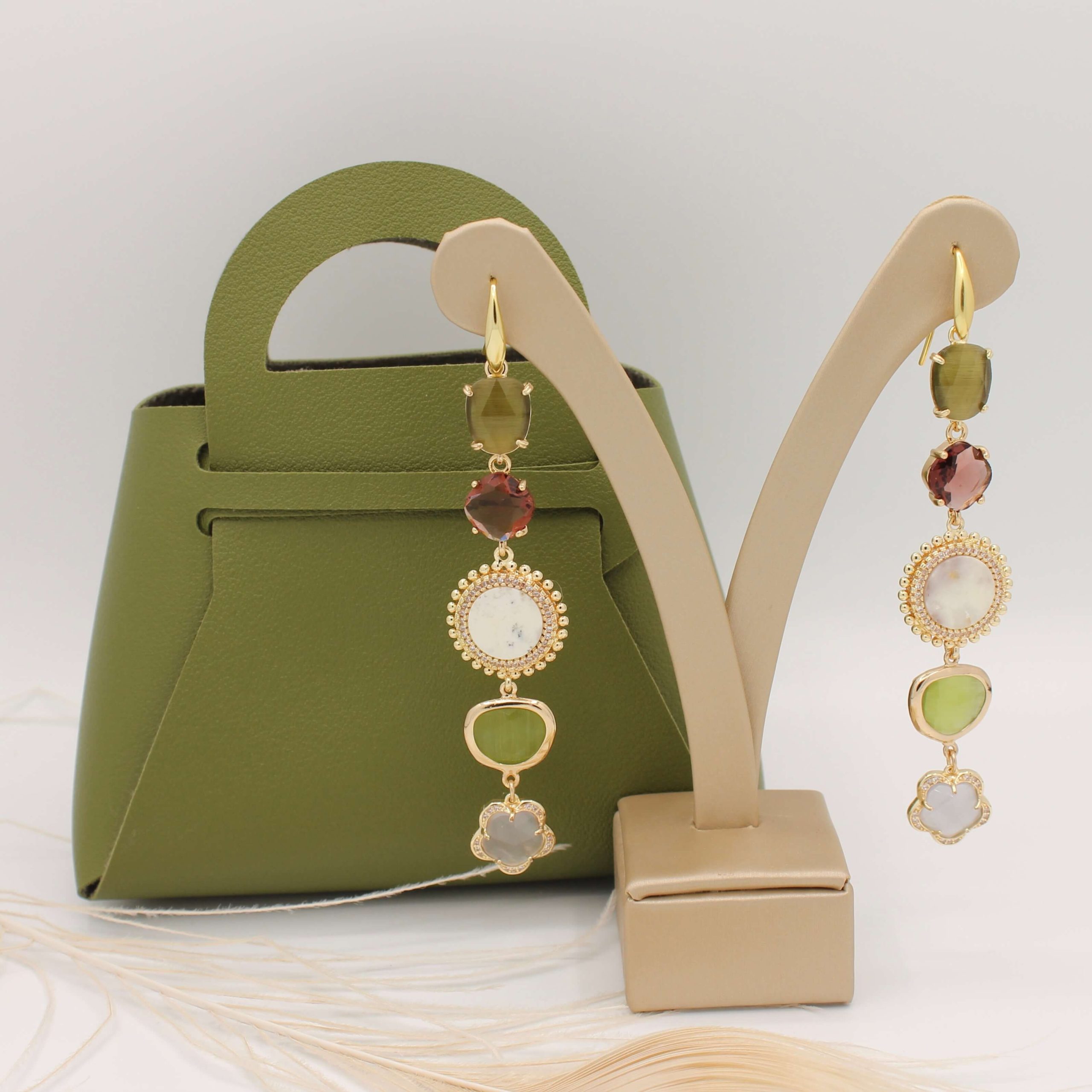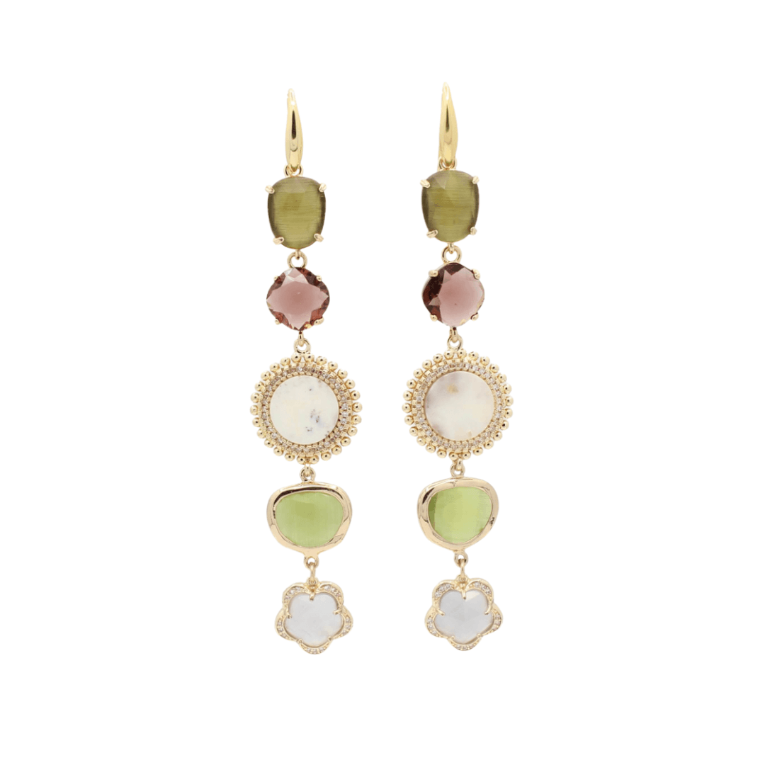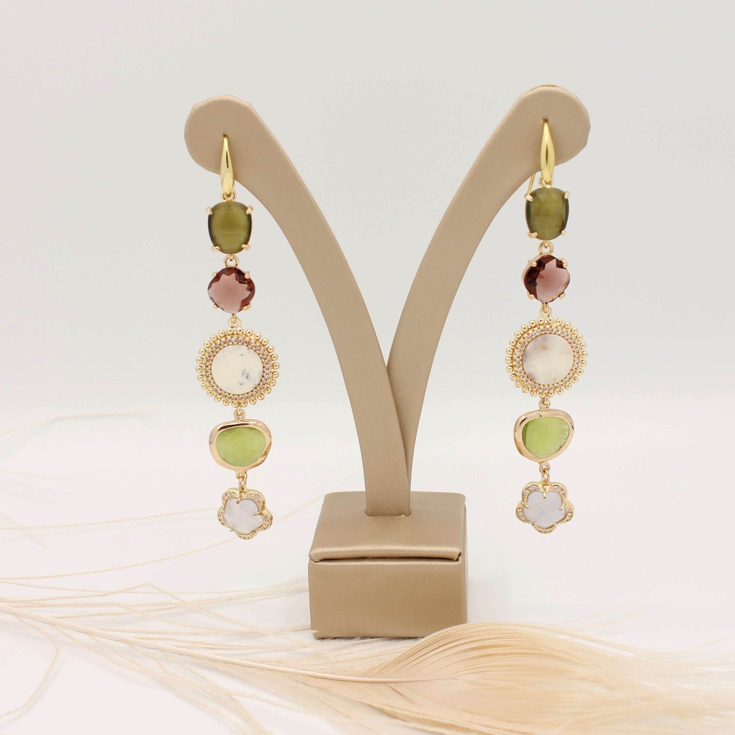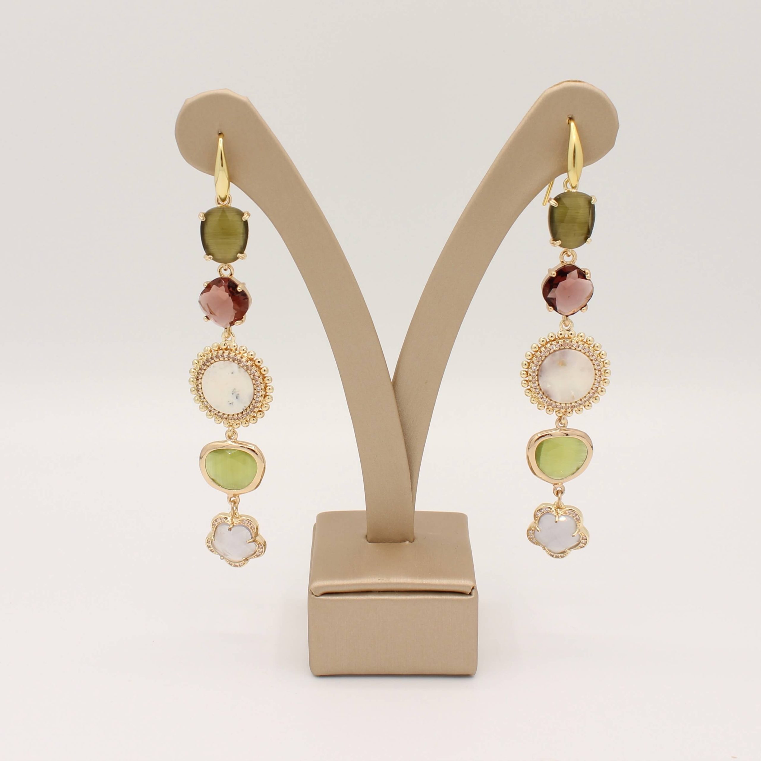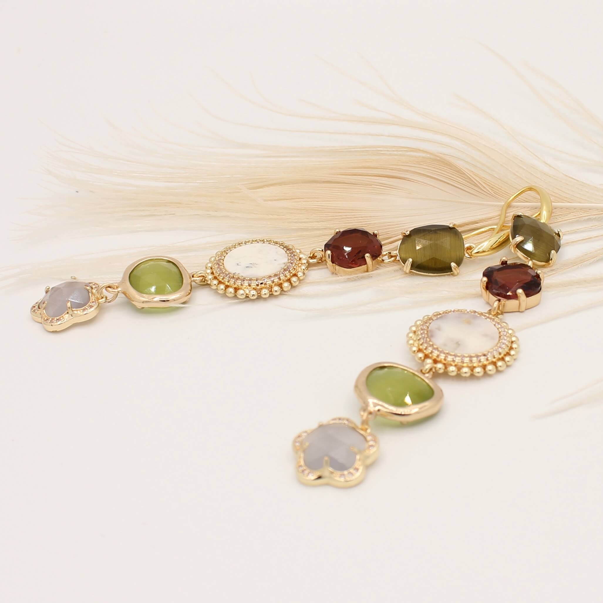 De Celebrate Life ~ X Long oorhangers combineren kristal en cat’s eye stenen in vijf harmonieuze kleuren: olijfgroen, burgundy, frisgroen, wit en soft grey. Deze mix zorgt voor een levendig maar toch ingetogen kleurenspel, waarmee je outfit direct meer karakter krijgt.