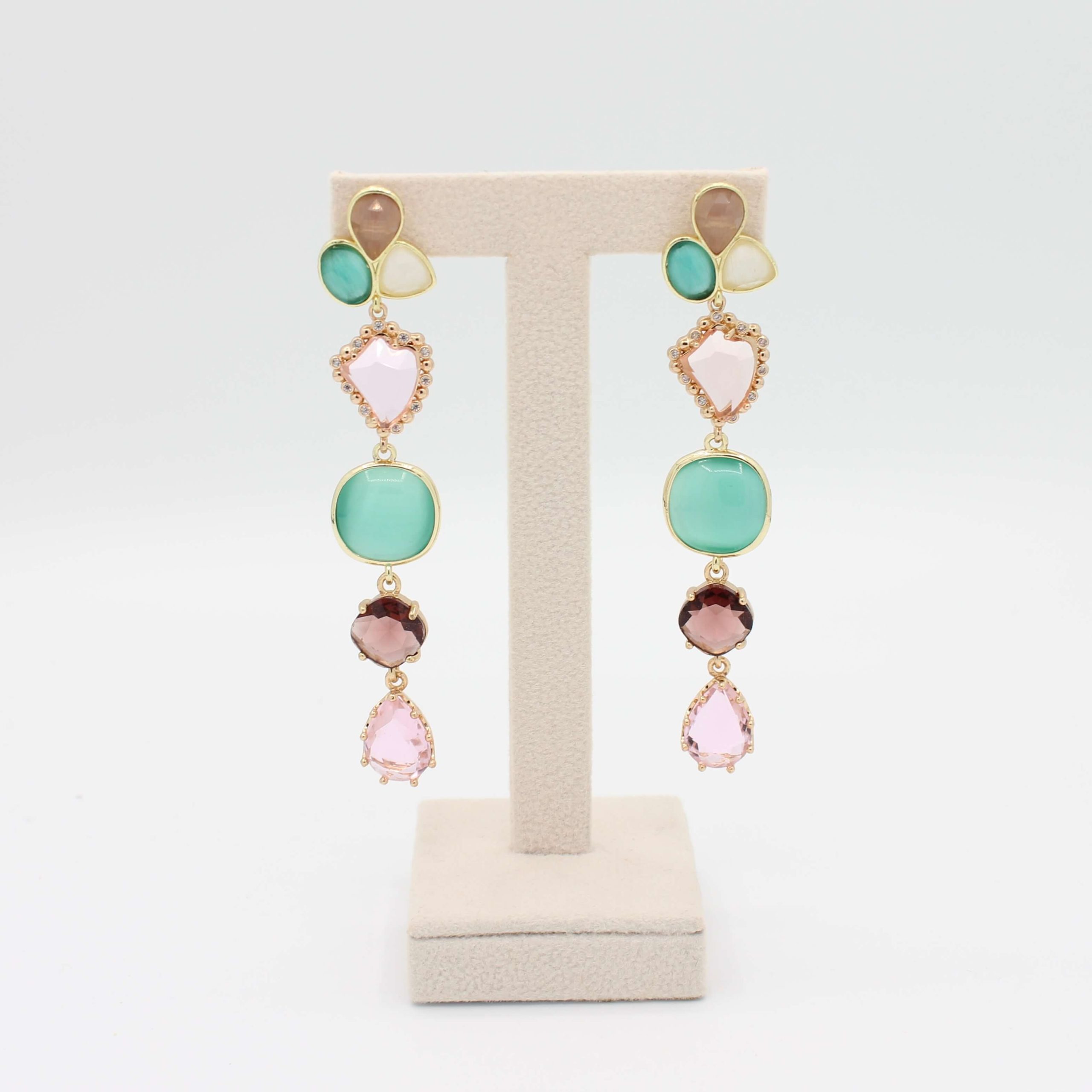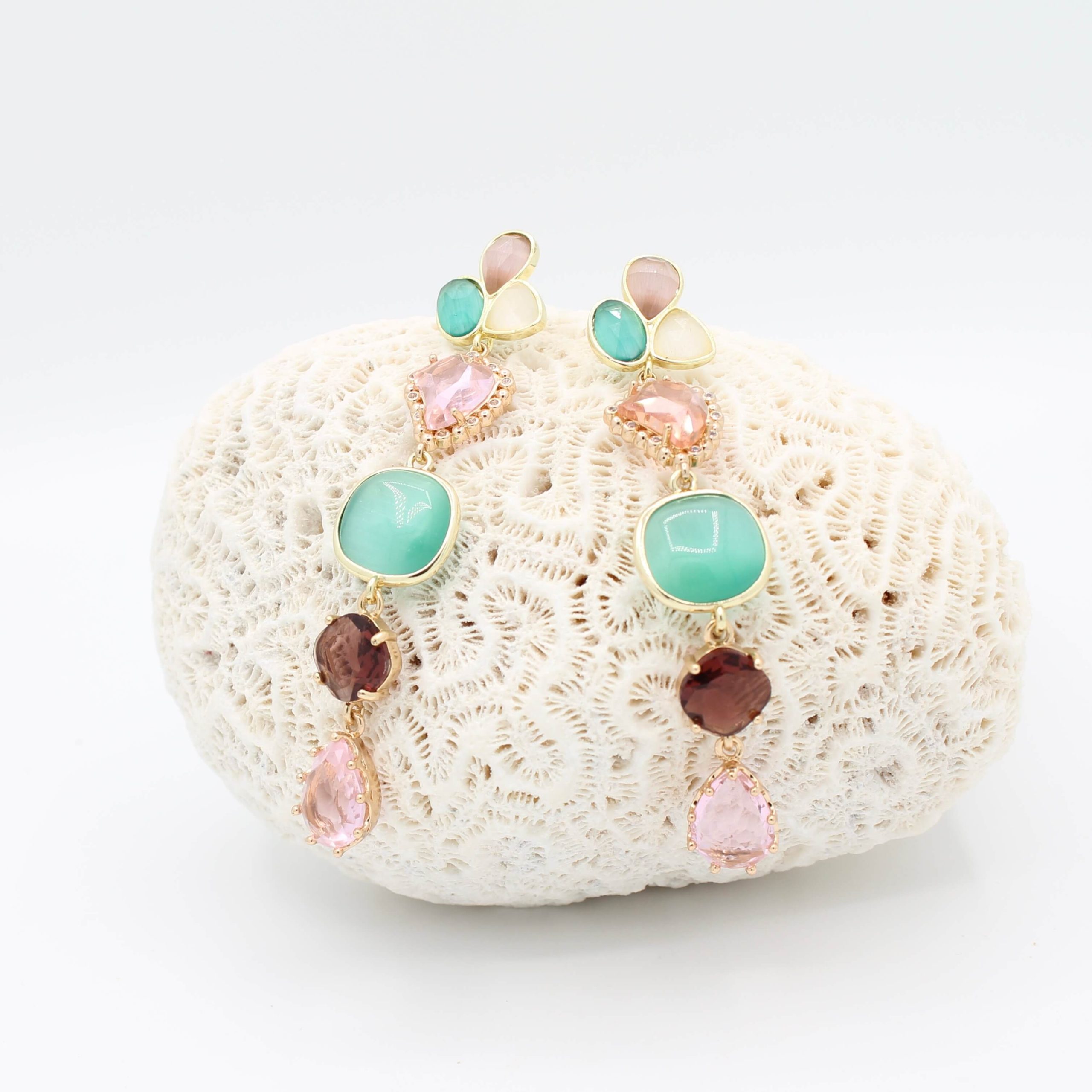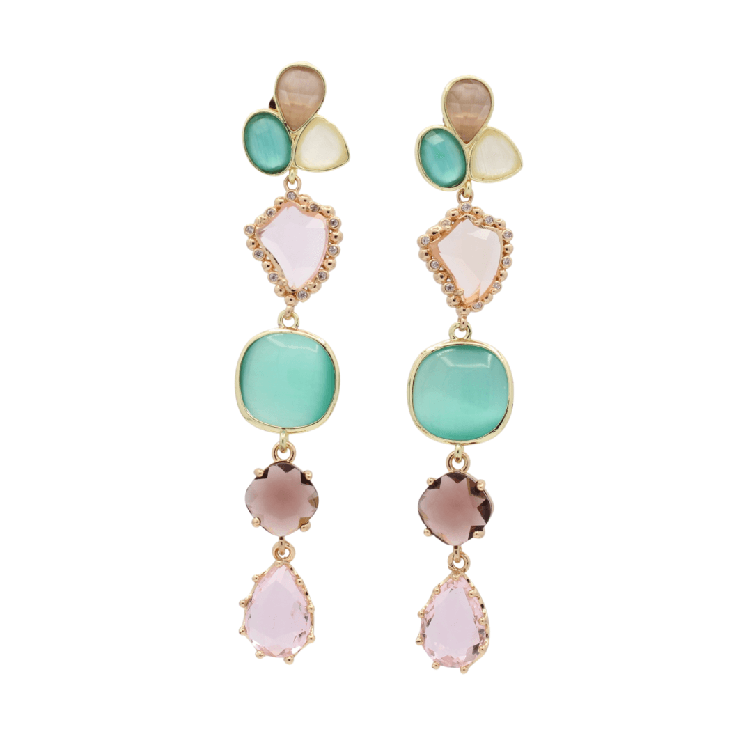 Maak een statement met de Celebrate Life ~ X Long oorstekers. Deze 9 cm lange oorbellen combineren drie cat’s eye stenen met vijf sierlijke hangers in paars, roze en groen. City chic, speels en stijlvol.