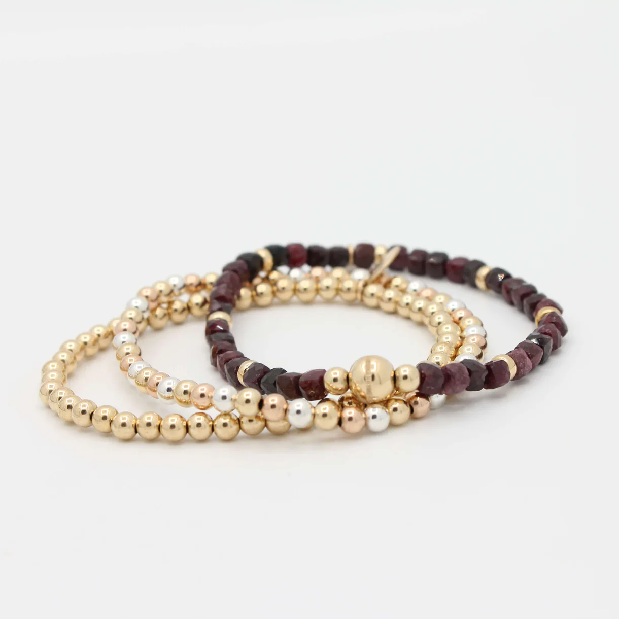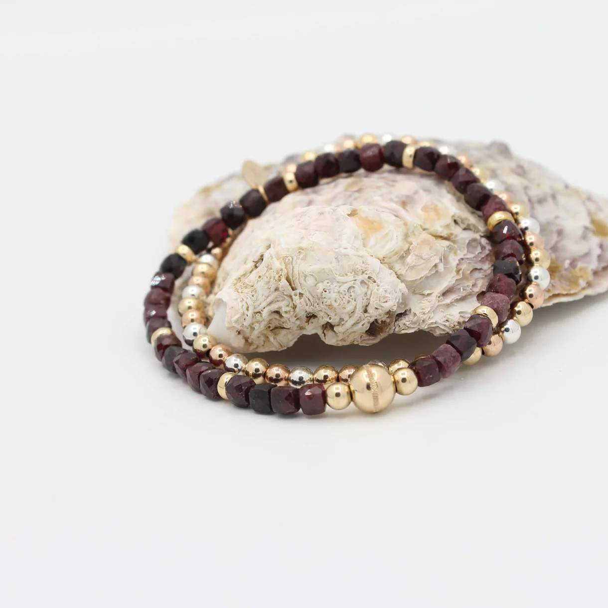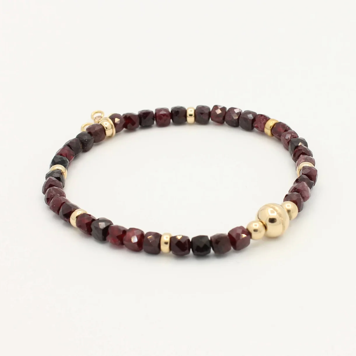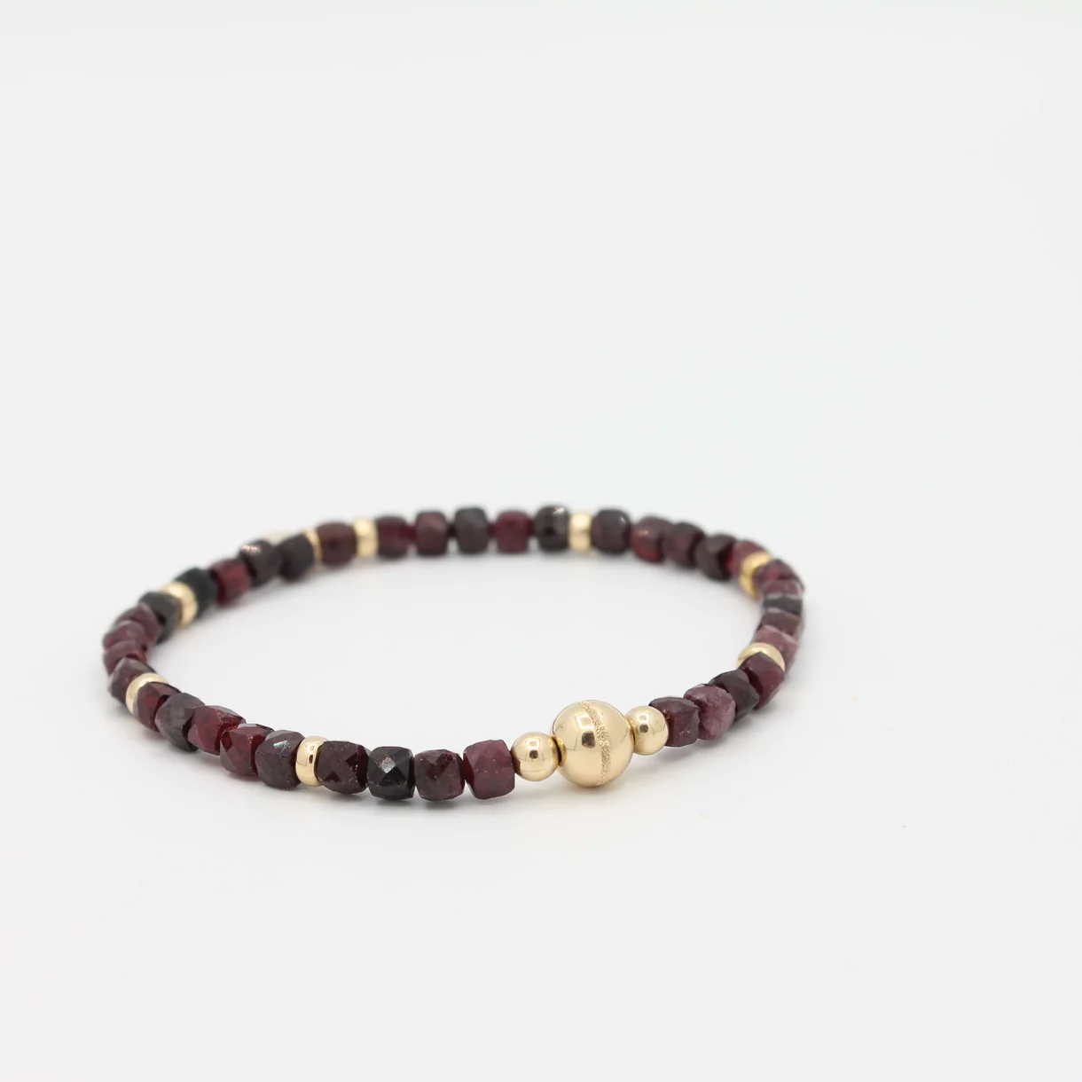 De Cube armband met Granaat combineert diep wijnrode kubusvormige granaat met 14K Gold Filled kralen. Een krachtig en elegant sieraad dat warmte en luxe uitstraalt.