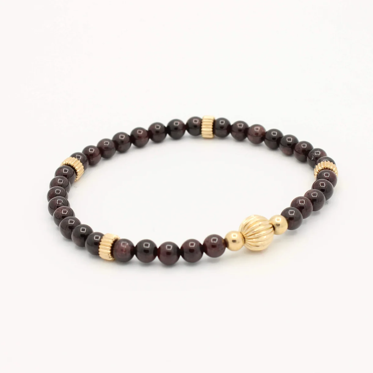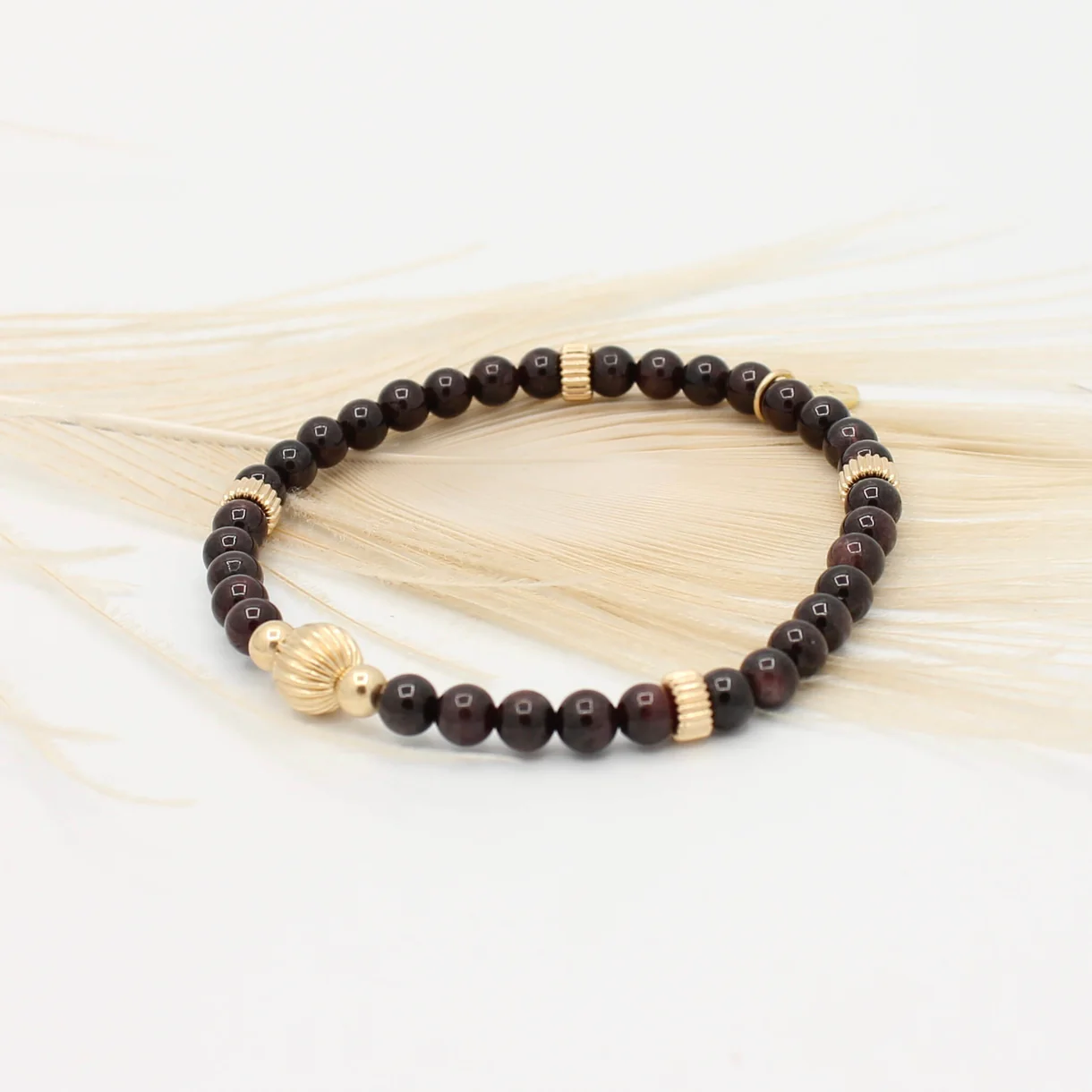 De Dark Granaat armband & Stripes combineert diep wijnrode granaatkralen met een opvallende Gold Filled striped kraal. Een stijlvol en krachtig sieraad dat warmte en elegantie uitstraalt.