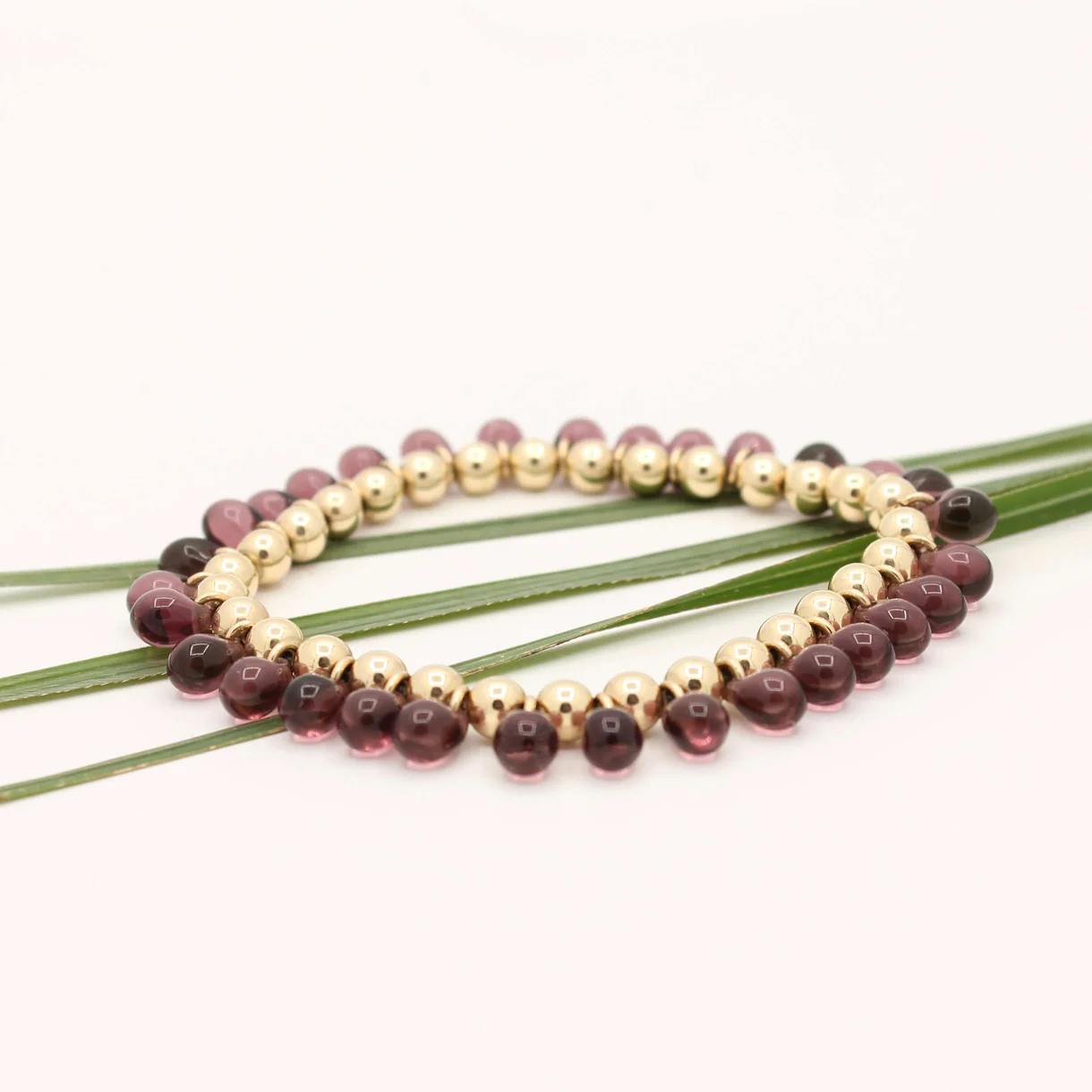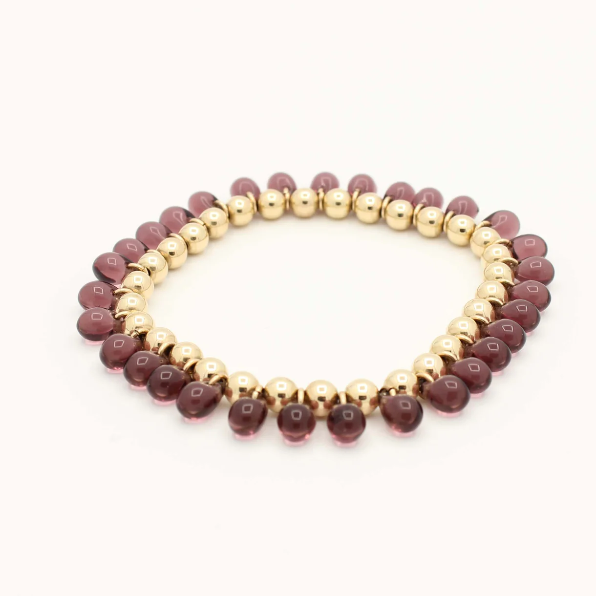 De armband is gemaakt met warme paarse glaskralen in druppelvorm. De intensiteit van het paars en de glanzende afwerking geven de armband een luxe uitstraling met een speels accent. Door de handmatige verwerking is elke kraal uniek in kleurnuance en vorm.