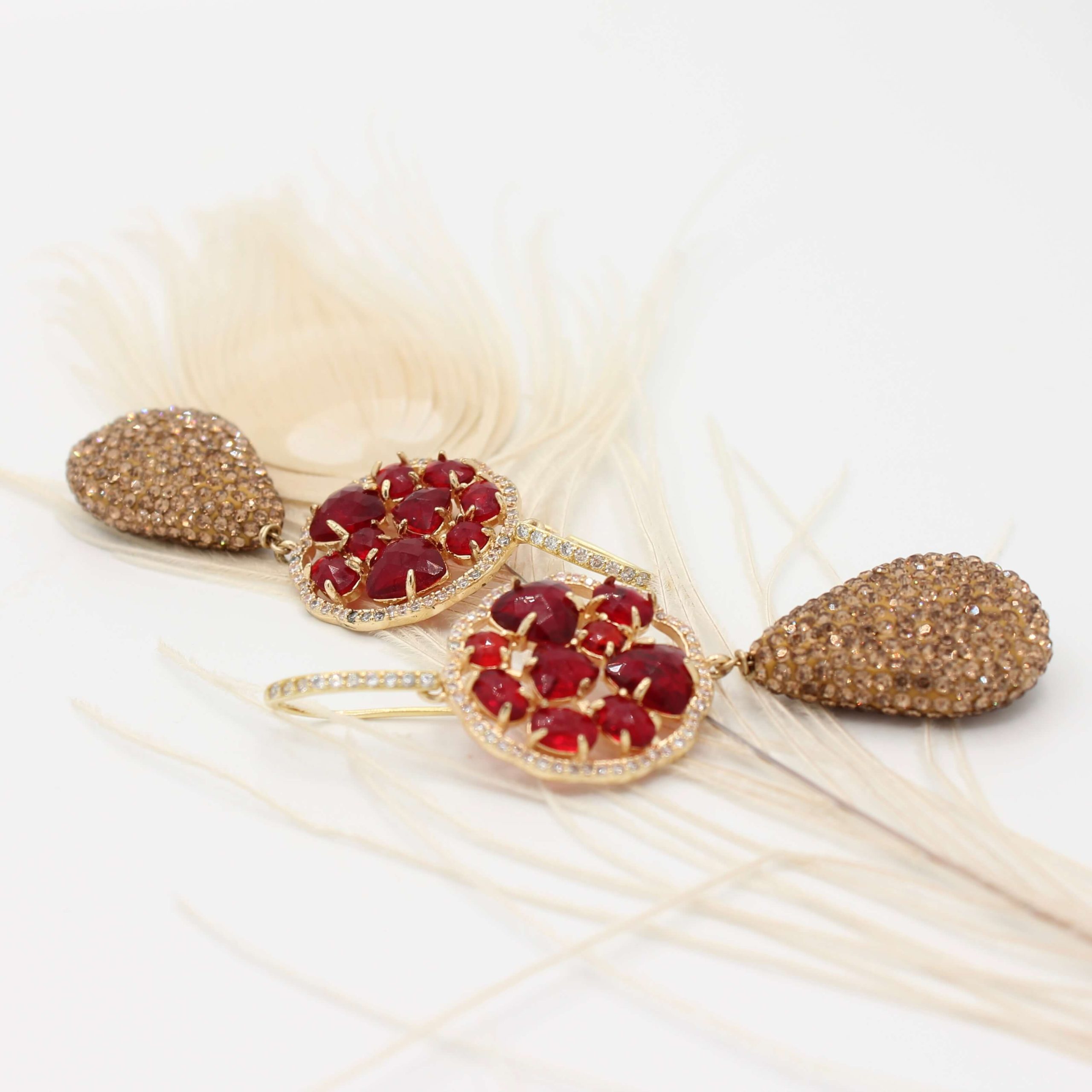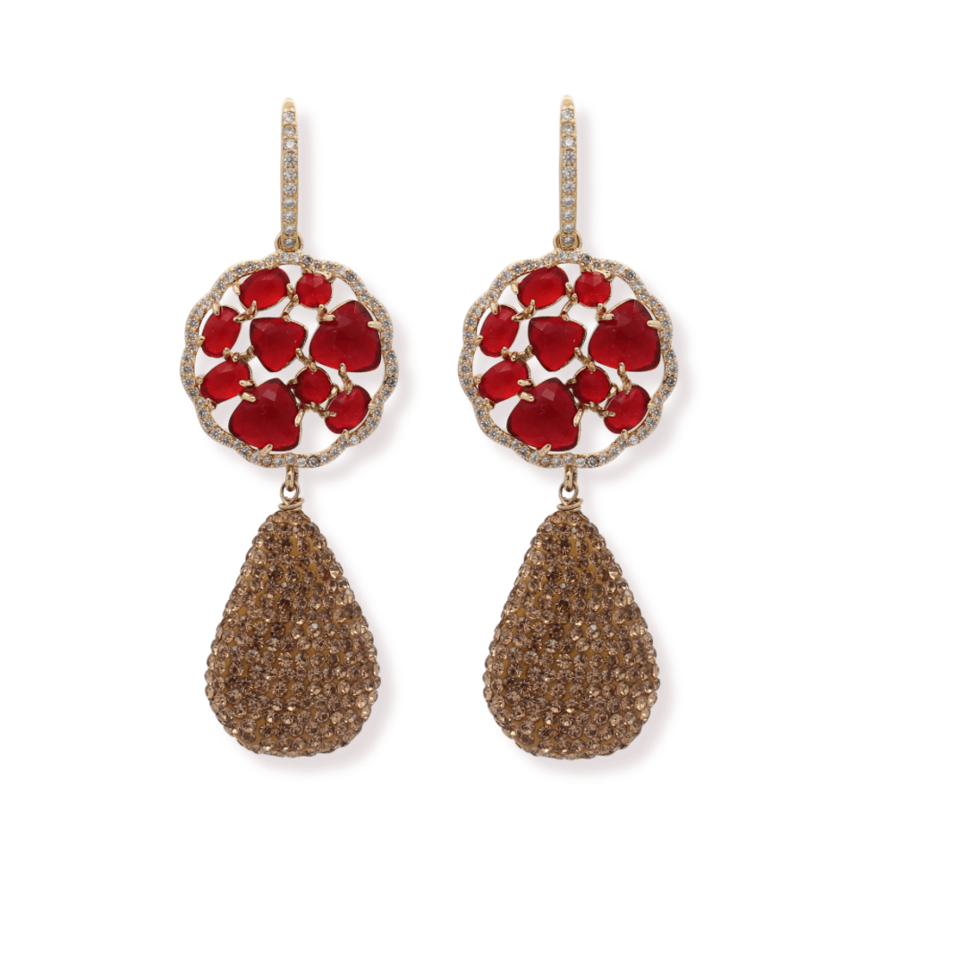 De Golden Flame oorhangers combineren de fonkelende glans van marcasiet met de levendige diepte van rode kristallen. De gouden marcasiet-druppel straalt een vintage chic allure uit, terwijl de bloem van rode kristallen warmte en karakter toevoegt. Subtiele zirconia details zorgen voor een verfijnde schittering, waardoor de oorbellen bij elke beweging tot leven komen.