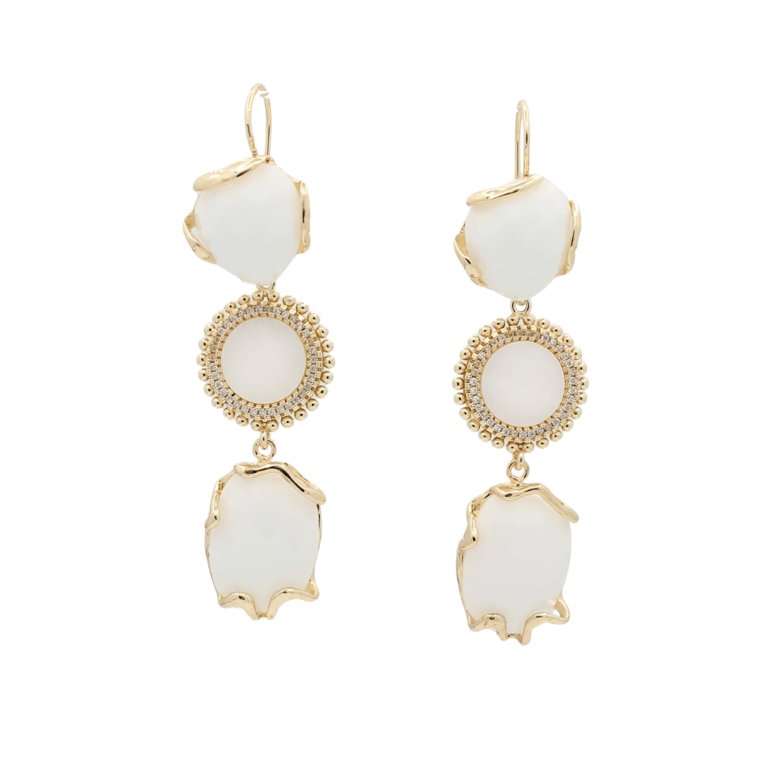 De oorbellen zijn handgemaakt met een basis van brons, wat zorgt voor stevigheid en een tijdloze afwerking. Het contrast tussen het natuurlijke wit van de agaat en de warme glans van het metaal geeft de oorbellen een elegante balans.