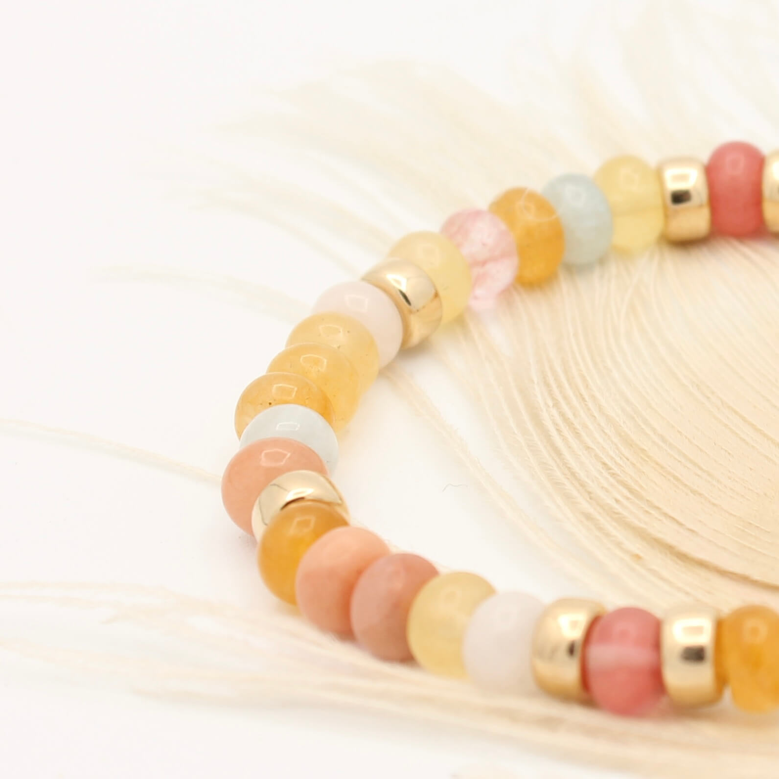 Deze armband brengt vier bijzondere edelstenen samen. Zonnesteen ( Sun stone ) met zijn warme oranje en perzik-rood tot goudbruine tint, Citrien ( Citrine ) in citroengeel tot warm oranje, zachte witte Maansteen en lichtroze Rozenkwarts. De natuurlijke schakeringen maken iedere armband uniek, waarbij elke steen een eigen karakter en kleurintensiteit toevoegt.