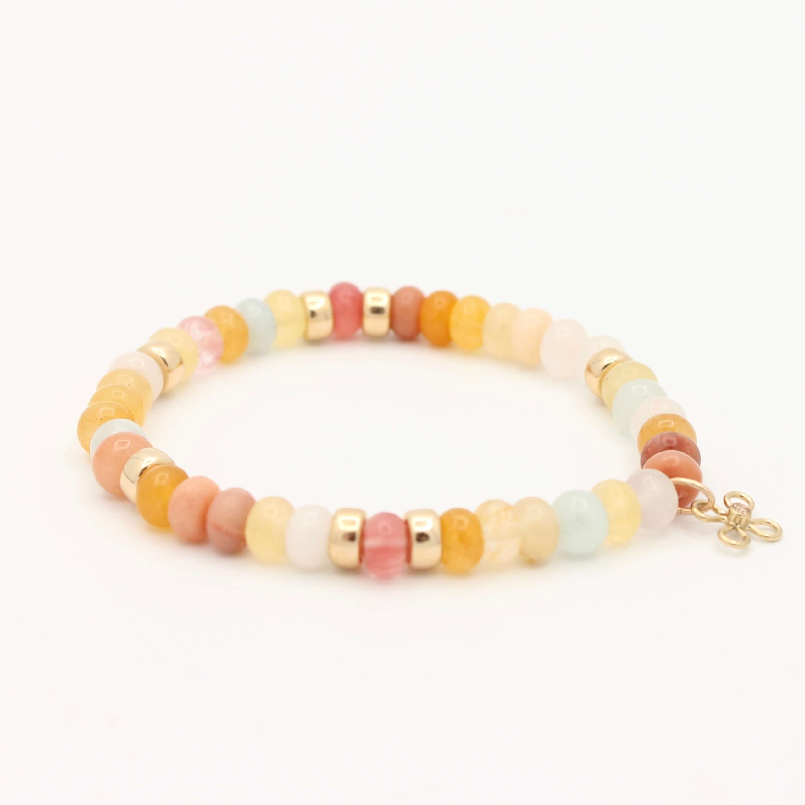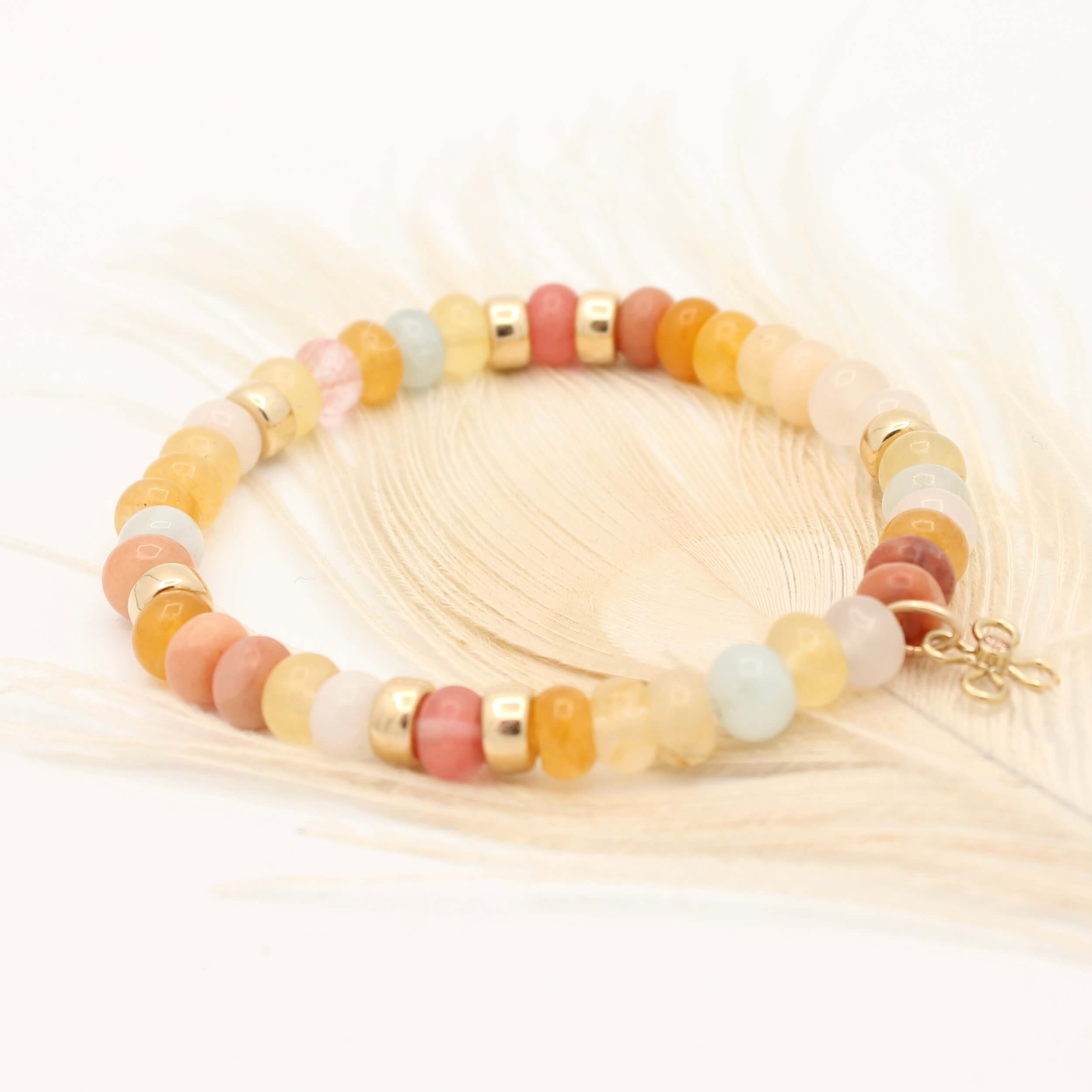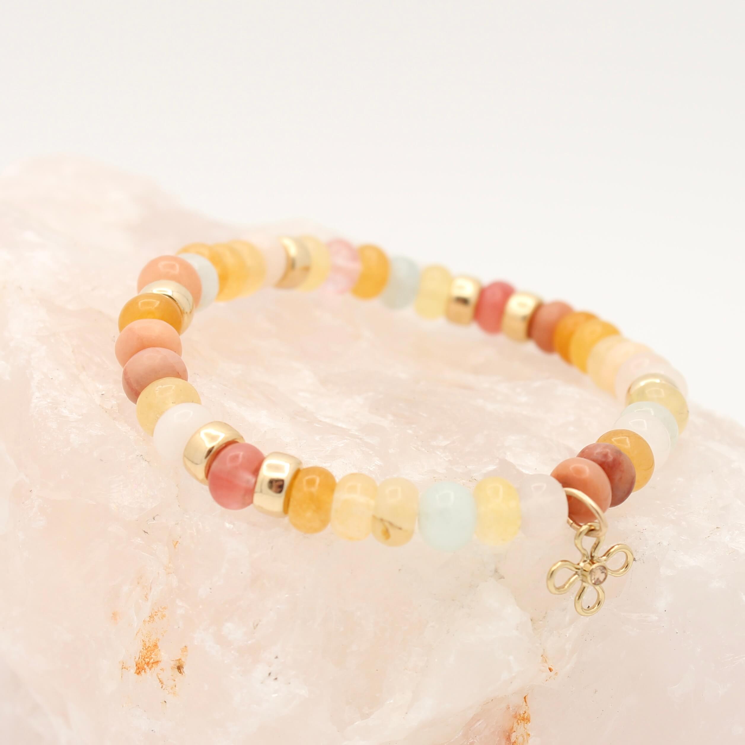 De Joy armband met Amazoniet, Aventurijn, Maansteen en Rozenkwarts combineert vier edelstenen in zachte kleuren met 14K Gold Filled details en een bloemaccent. Een verfijnd en uniek handgemaakt sieraad.