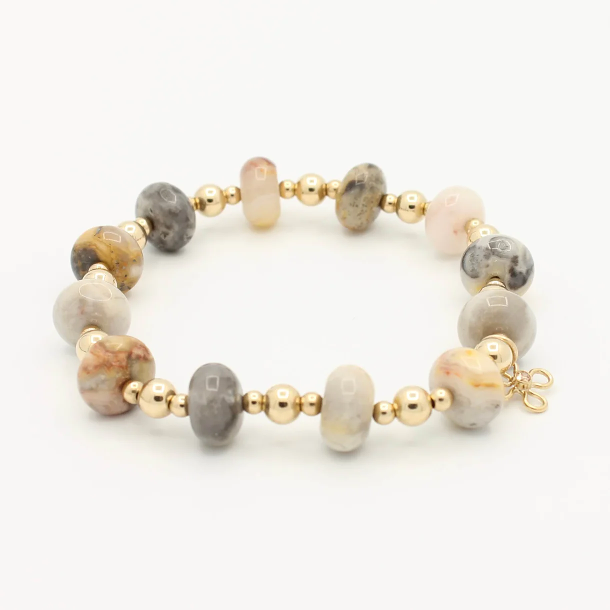 De Maxime armband met Picasso Jaspis is een stijlvol sieraad dat natuurlijke schoonheid combineert met luxe. De multicolor rondellen van Picasso Jaspis geven een uniek patroon, versterkt door de warme glans van 14K Gold Filled kralen.