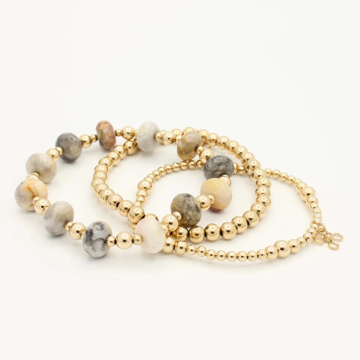 Deze set bestaat uit drie losse armbanden die samen een stijlvol geheel vormen. Draag ze allemaal tegelijk voor een opvallende look of combineer er één of twee met andere sieraden uit je collectie. De combinatie van natuurlijke steen en goudkleurige accenten maakt de set geschikt voor zowel casual als feestelijke gelegenheden.