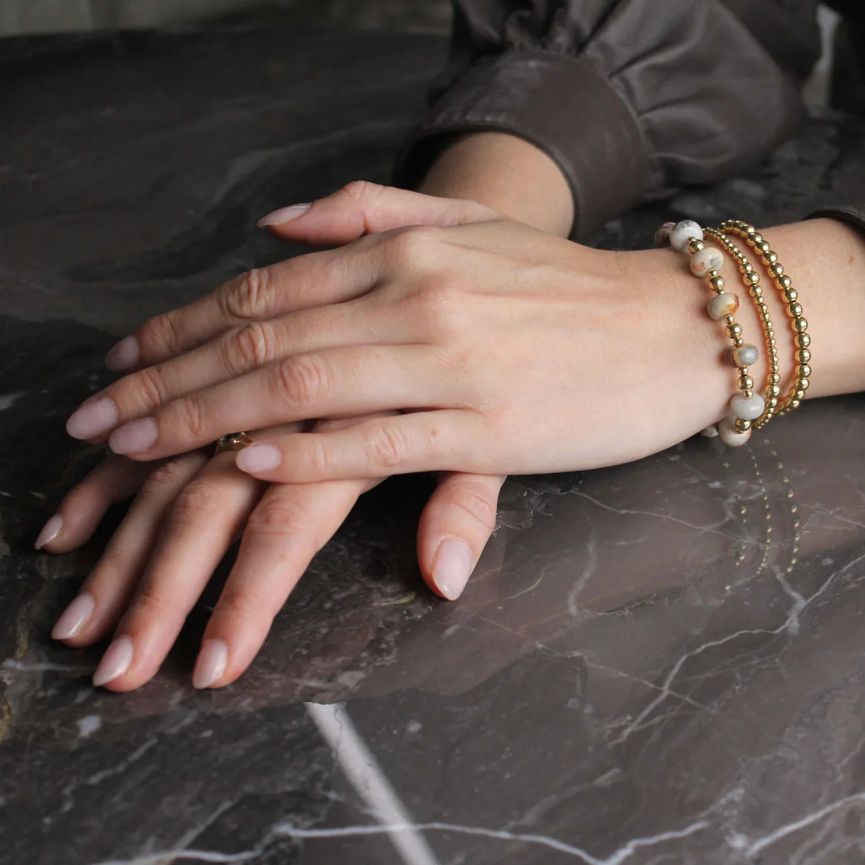 De armbanden zijn gecombineerd met Gold Filled 14K kralen van 4 en 6 mm. Dankzij de dikke goudlaag behouden de kralen hun warme glans, zonder snel te verkleuren of te slijten. Gold Filled is bovendien hypoallergeen, wat het een fijne keuze maakt voor dagelijks gebruik, ook voor mensen met een gevoelige huid.