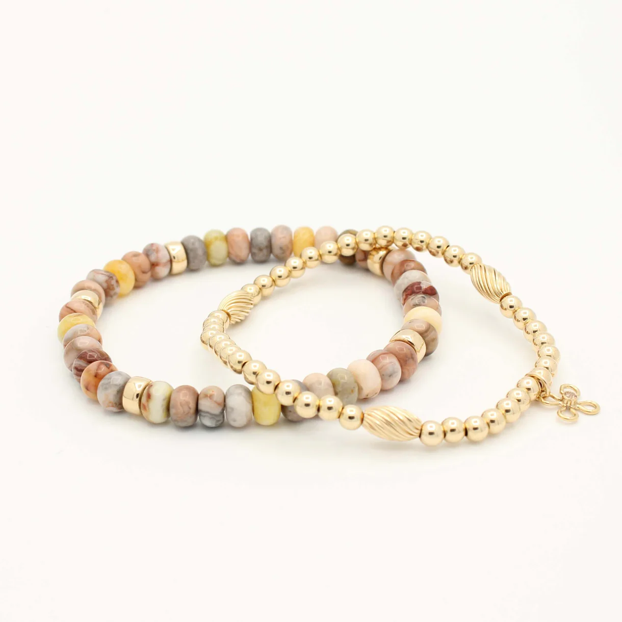 De armbanden zijn afgewerkt met Gold Filled 14K kralen van 4 mm, waaronder drie speciaal gedraaide kralen die zorgen voor een speels detail. Gold Filled staat bekend om zijn duurzame kwaliteit: de dikke laag 14K goud blijft jarenlang mooi, zonder snel te verkleuren of te slijten. Bovendien zijn deze kralen hypoallergeen en daardoor prettig om dagelijks te dragen.