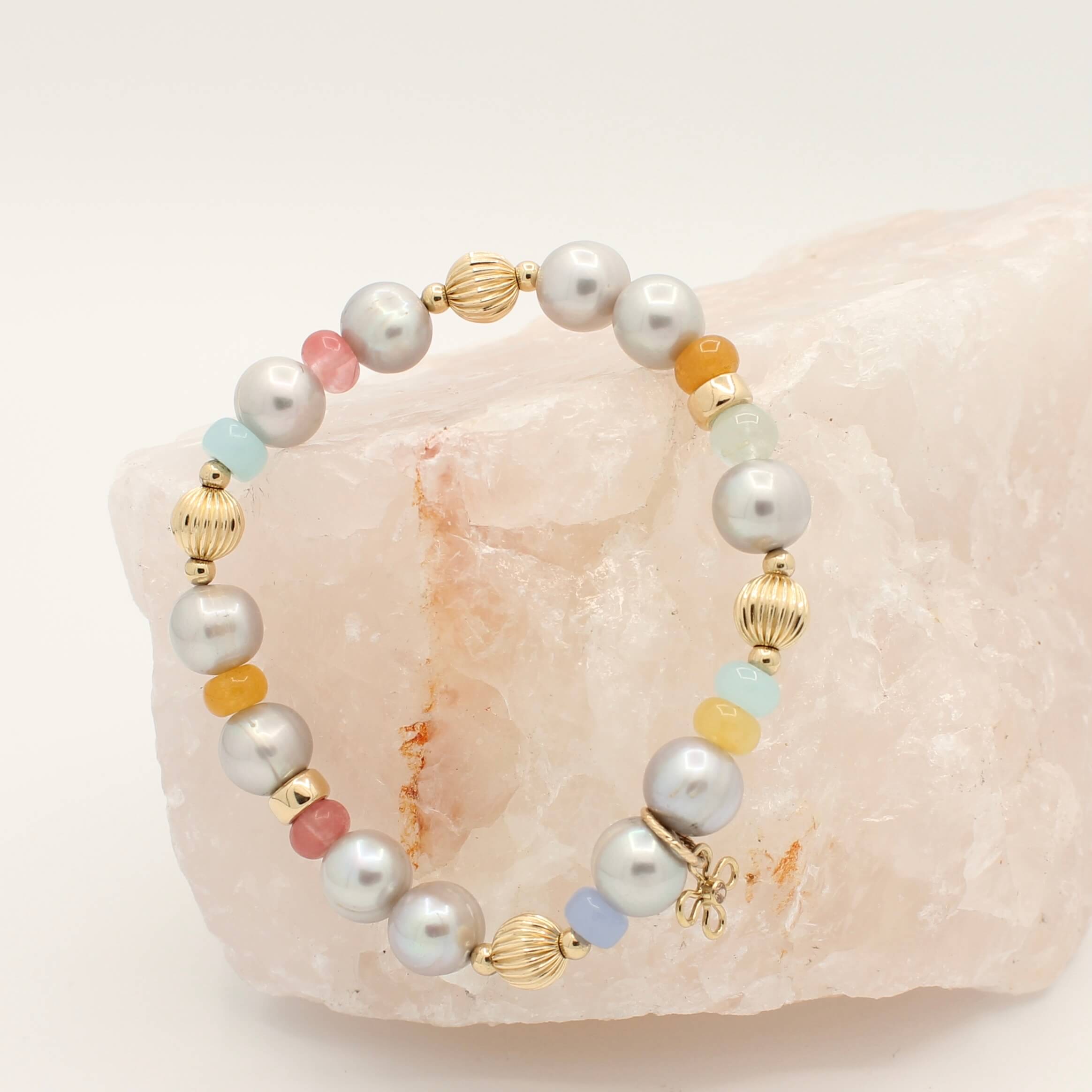 De Original Gold Filled | Stripe | 3 & 8 mm armband, gecombineerd met zoetwater parels is een elegante armband waarin klassieke parels met 3 mm kralen gold filled worden gecombineerd met vier opvallende gestreepte gold filled kralen van 8 mm. Het subtiele reliëf van de gestreepte kralen geeft dit sieraad een extra dimensie en maakt het net even anders dan een gewone basic. De vrolijk gekleurde edelsteen rondellen geven de armband een casual tot chic look. Kleurrijke elegantie.