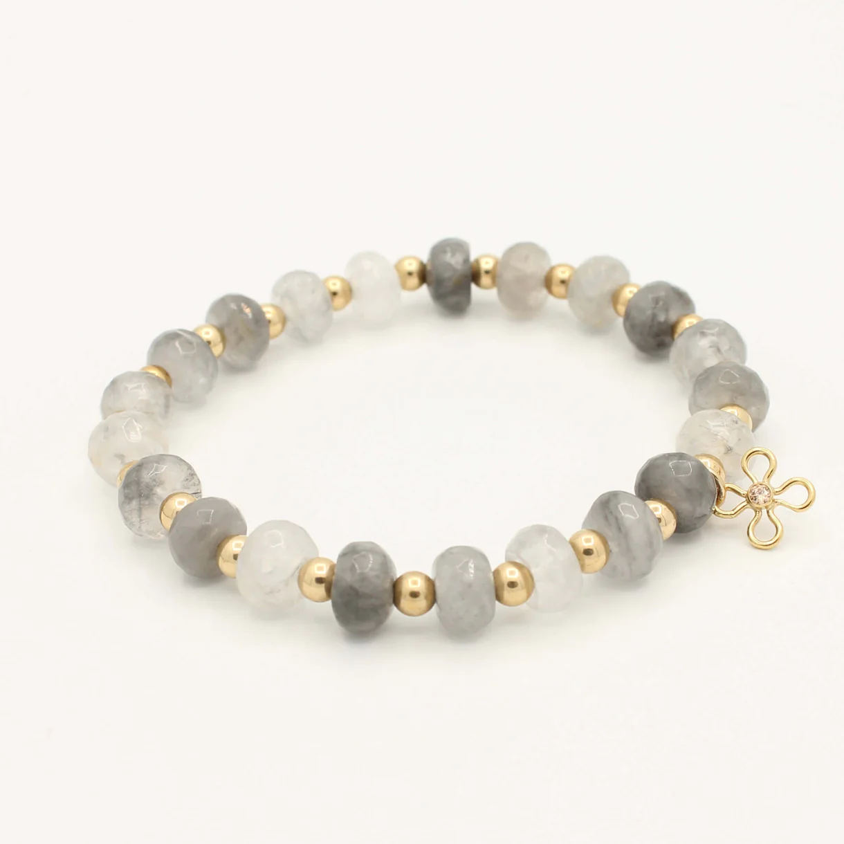 De Shades of Grey armband combineert grijze agaat rondellen met 4 mm Original Gold Filled 14K kralen. Een elegante armband die neutrale tinten met luxe goud samenbrengt.