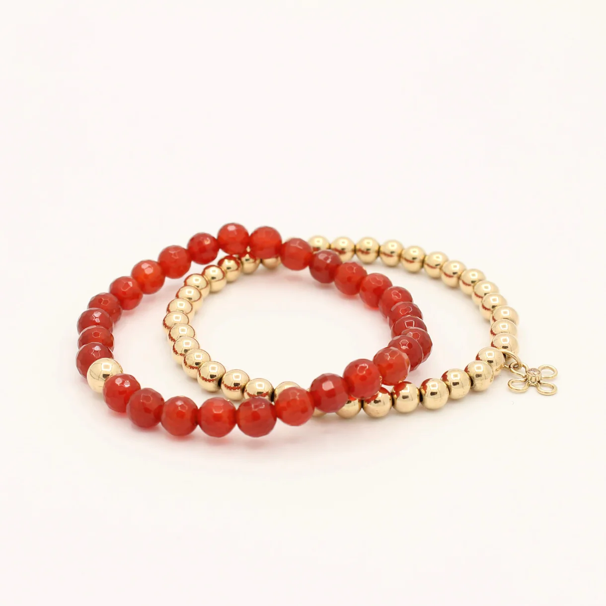 De eerste armband bestaat volledig uit 5 mm gold filled kralen – stijlvol en klassiek. De tweede armband voegt daar een opvallend accent van carneool aan toe, subtiel gecombineerd met kleine gold filled details. Samen vormen de armbanden een veelzijdige set die je zowel samen als afzonderlijk kunt dragen. Perfect om je outfit van een vrolijke en elegante touch te voorzien.