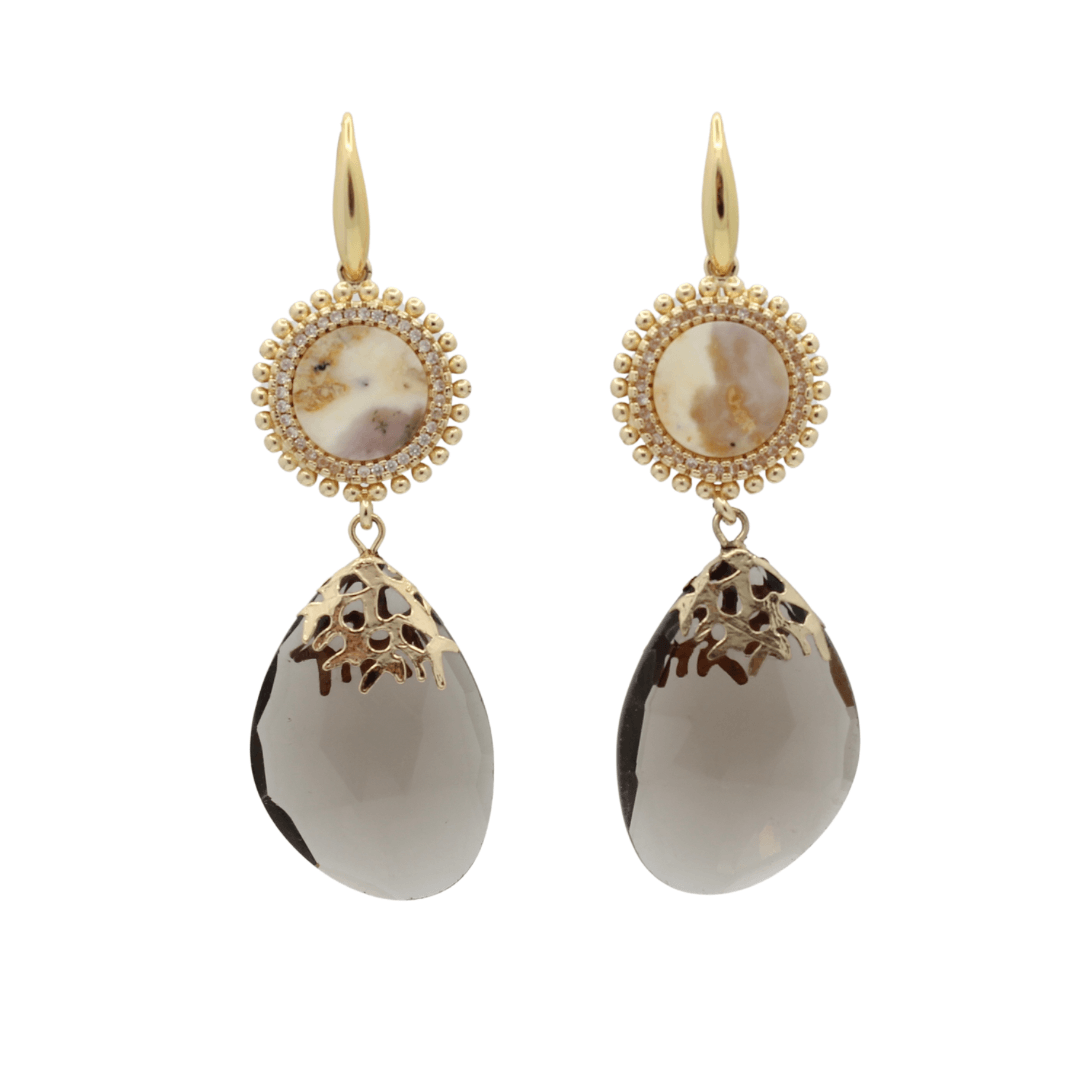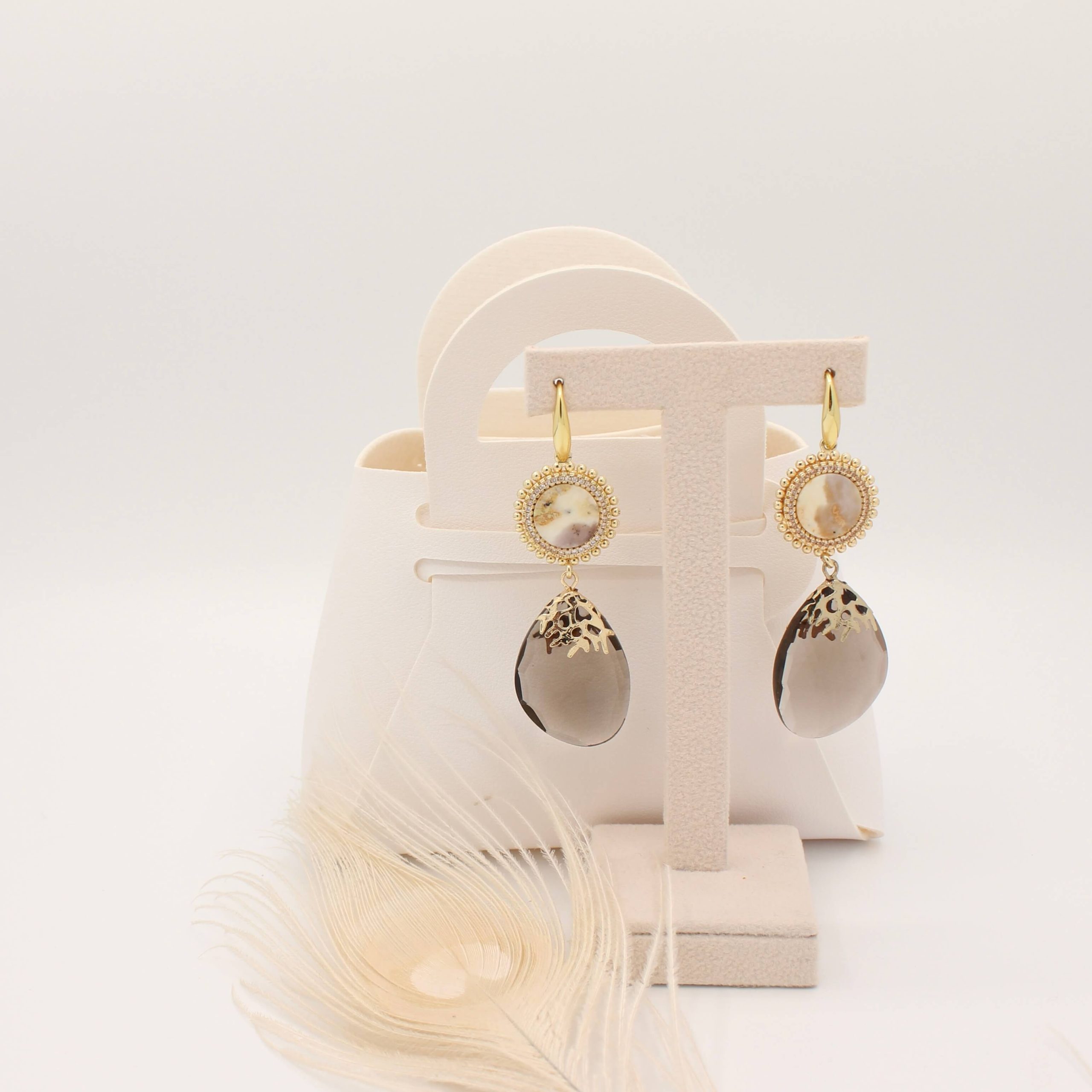 Ontdek de verfijnde schoonheid van de Taupe Tide oorhangers. Deze 7 cm lange oorbellen combineren oceaanagaat met een taupekleurige kristalhanger, omlijst door subtiele zirconia details. Gemaakt van verguld sterling zilver voor een luxueuze en tijdloze uitstraling.
